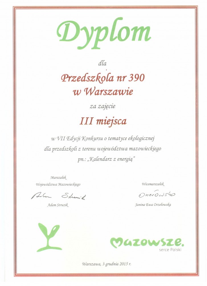 Przedszkole zajęło III miejsce w Konkursie mazowieckim pt. „Kalendarz z energią” organizowanym przez Marszałka Województwa Mazowieckiego.
